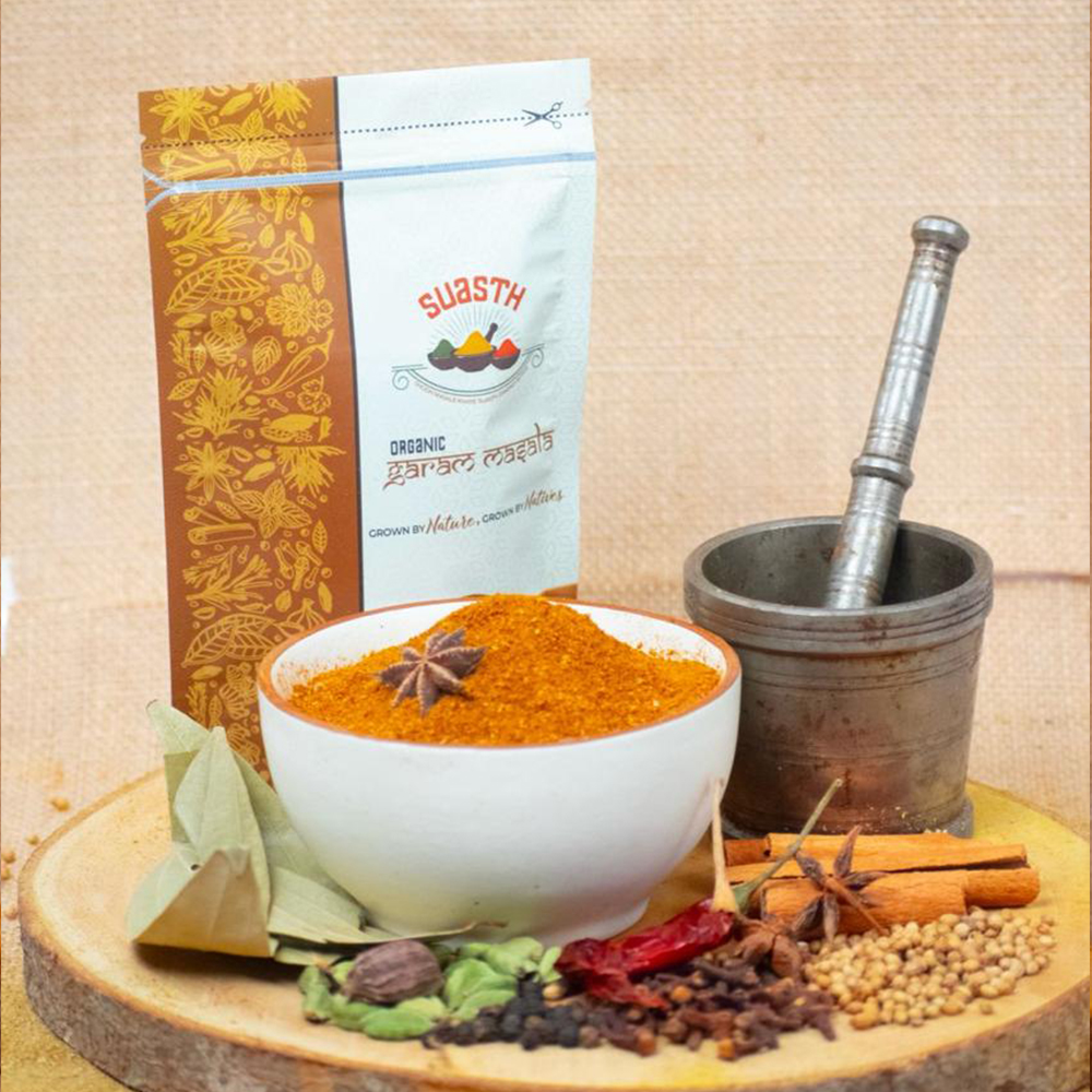 A unique blend of organic whole spices, roasted and ground for a complex and aromatic flavor profile. The exact blend may vary, but typically includes cloves, cinnamon, cardamom, black pepper, and cumin. Adds warmth, depth, and a touch of sweetness to curries, dals, vegetables, and marinades. May aid digestion (disclaimer: consult a medical professional for confirmation).